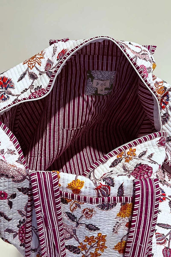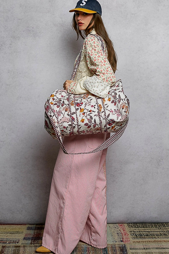Fabric: 100% COTTON A soft, quilted bag featuring a lively multicolor print and framed with pink striped binding for a...