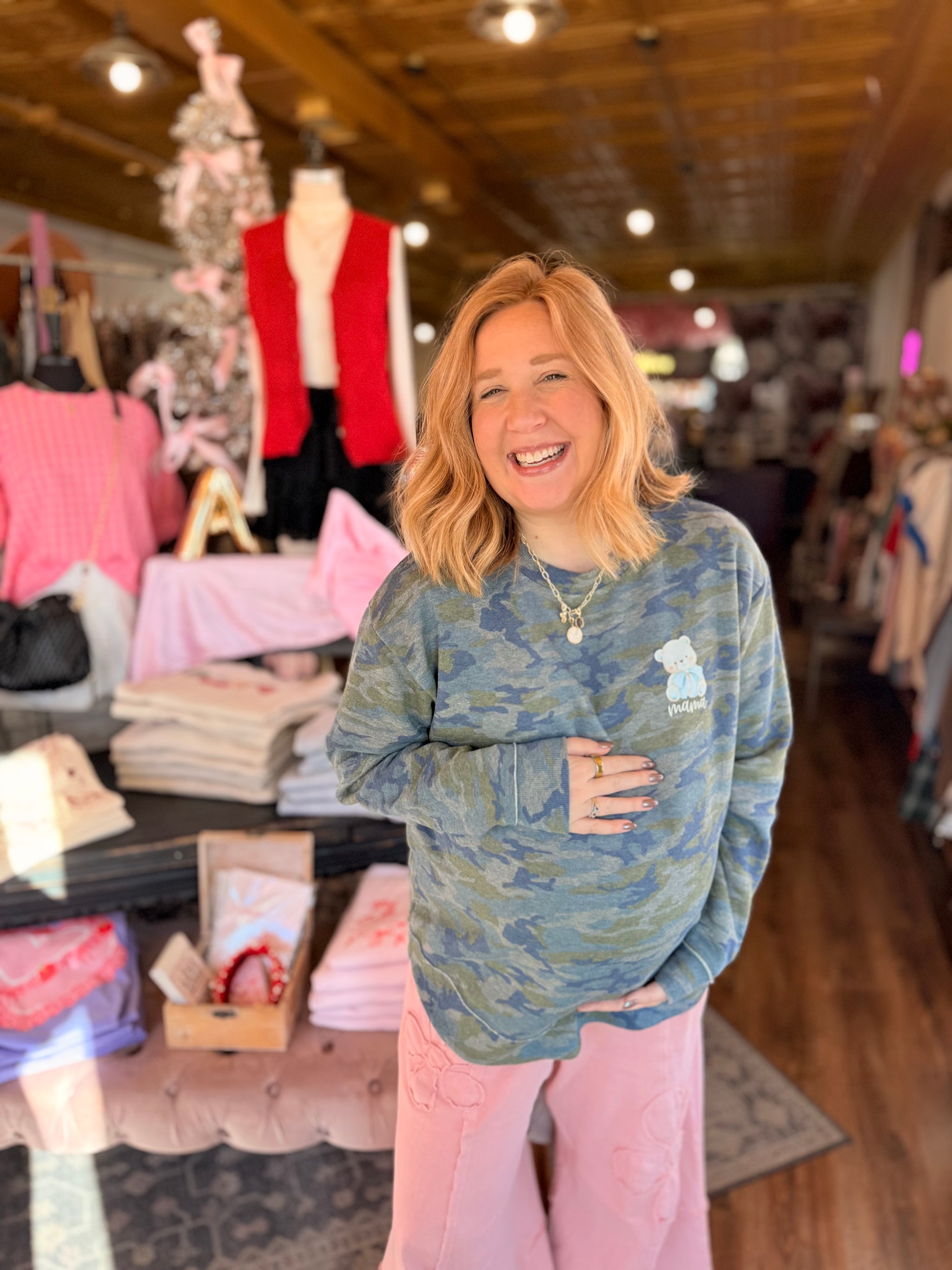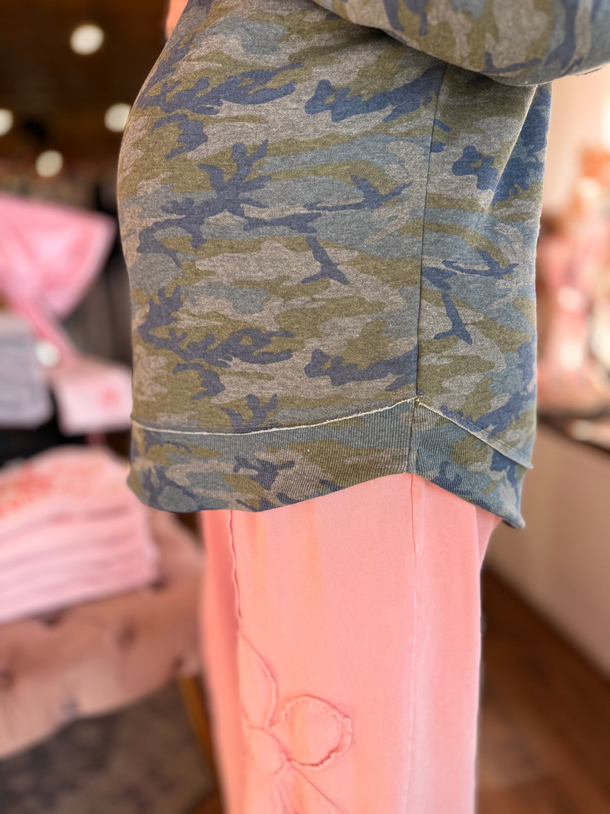 This vintage camo is the perfect neutral for all the mama bears. A womens cut with a double rounded hem.Â
