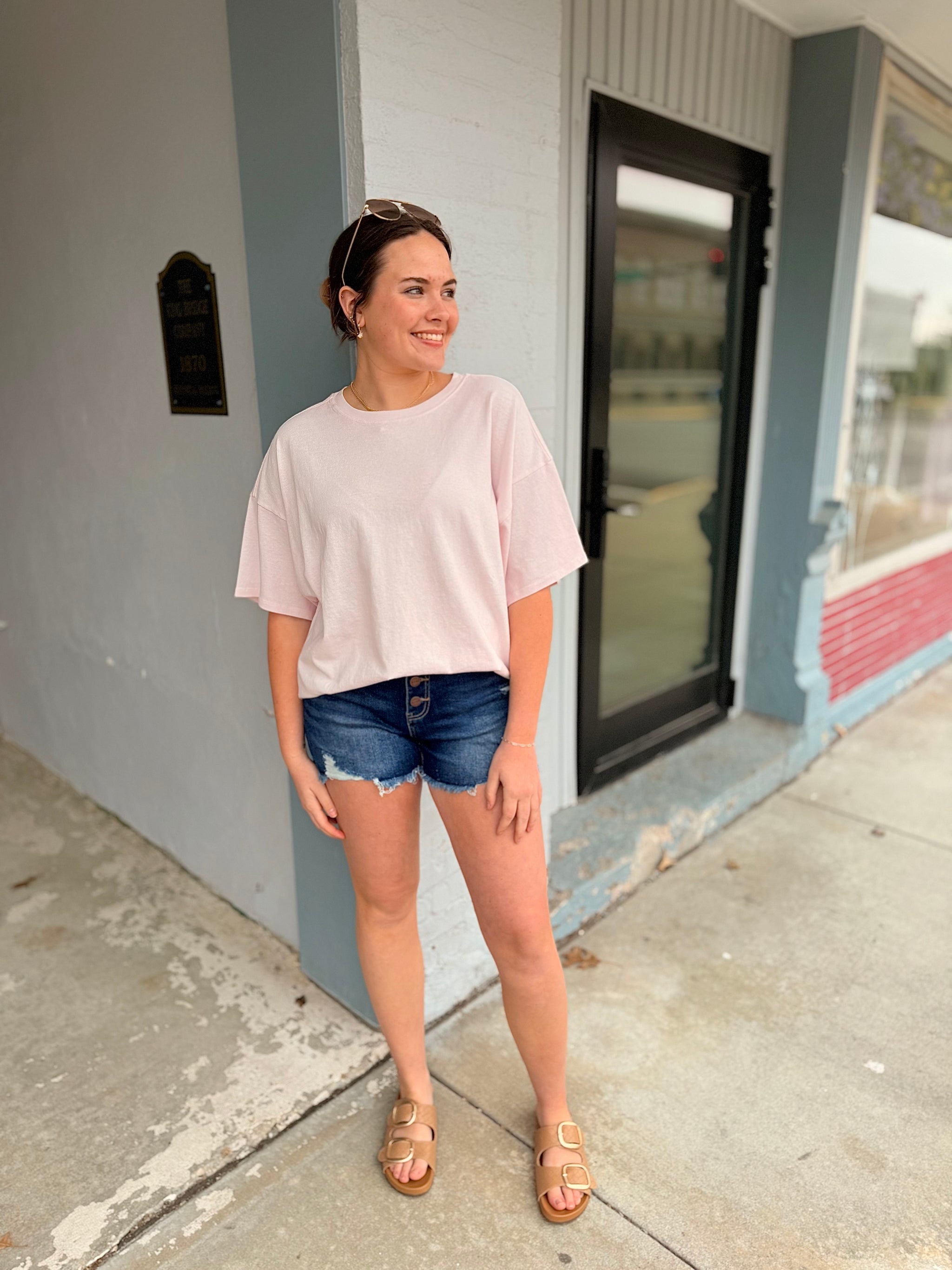 This oversized tee features a classic crew neckline and boxy drop shoulders with wide, relaxed sleeves. It is crafted for...