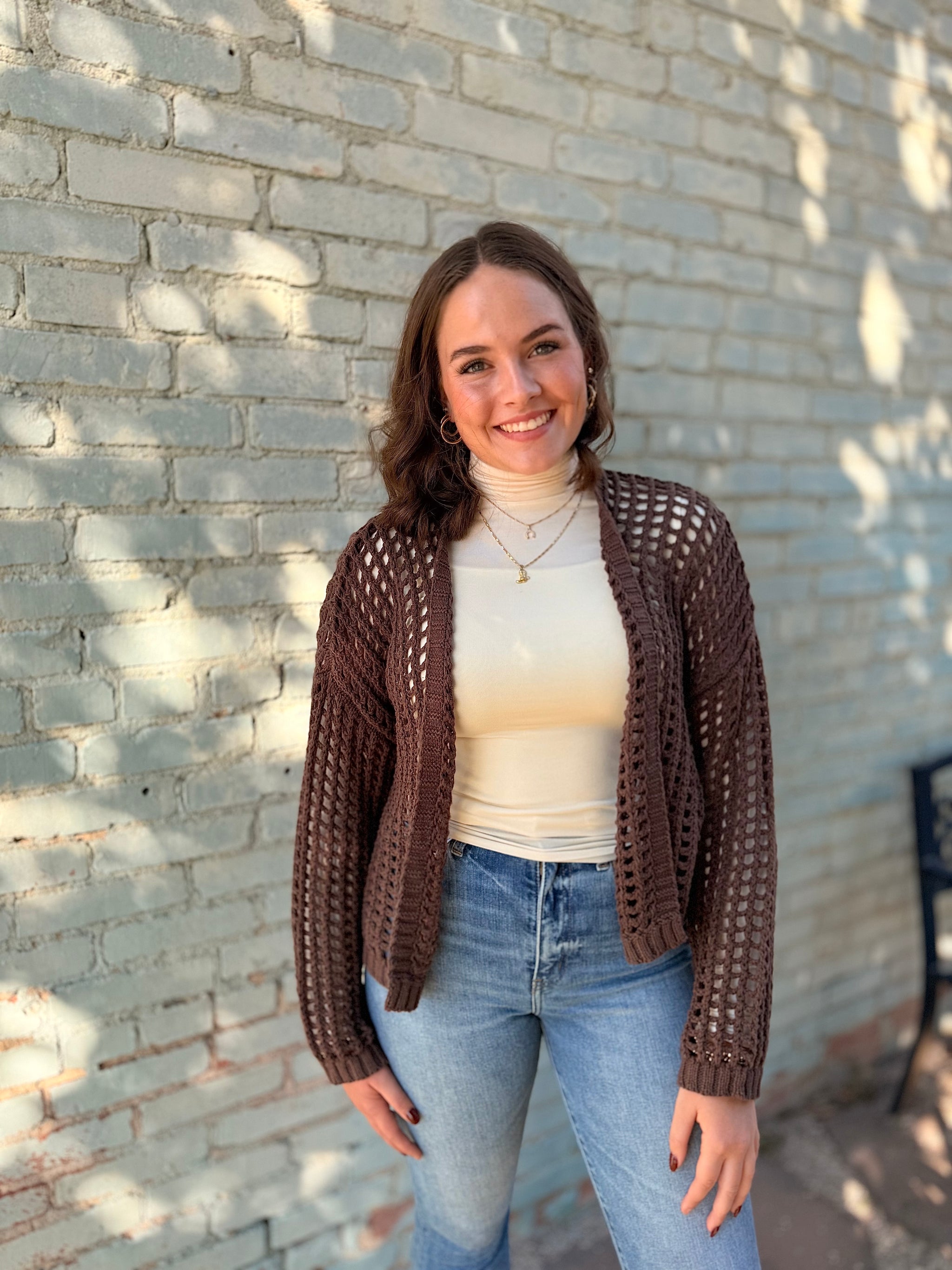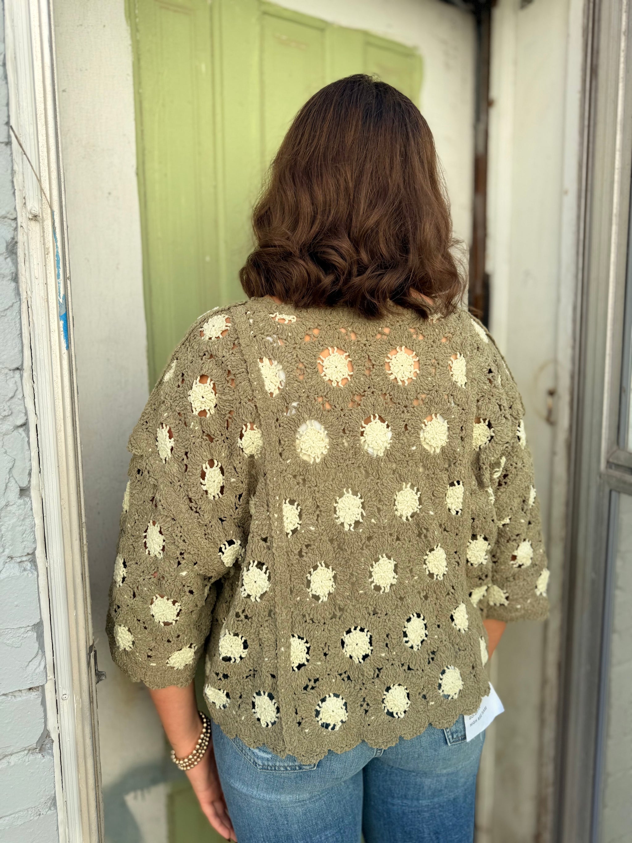 One Size. Designed in round neck 3/4 sleeve roomy fit top in crochet with varied colors, border accents, and pattern...