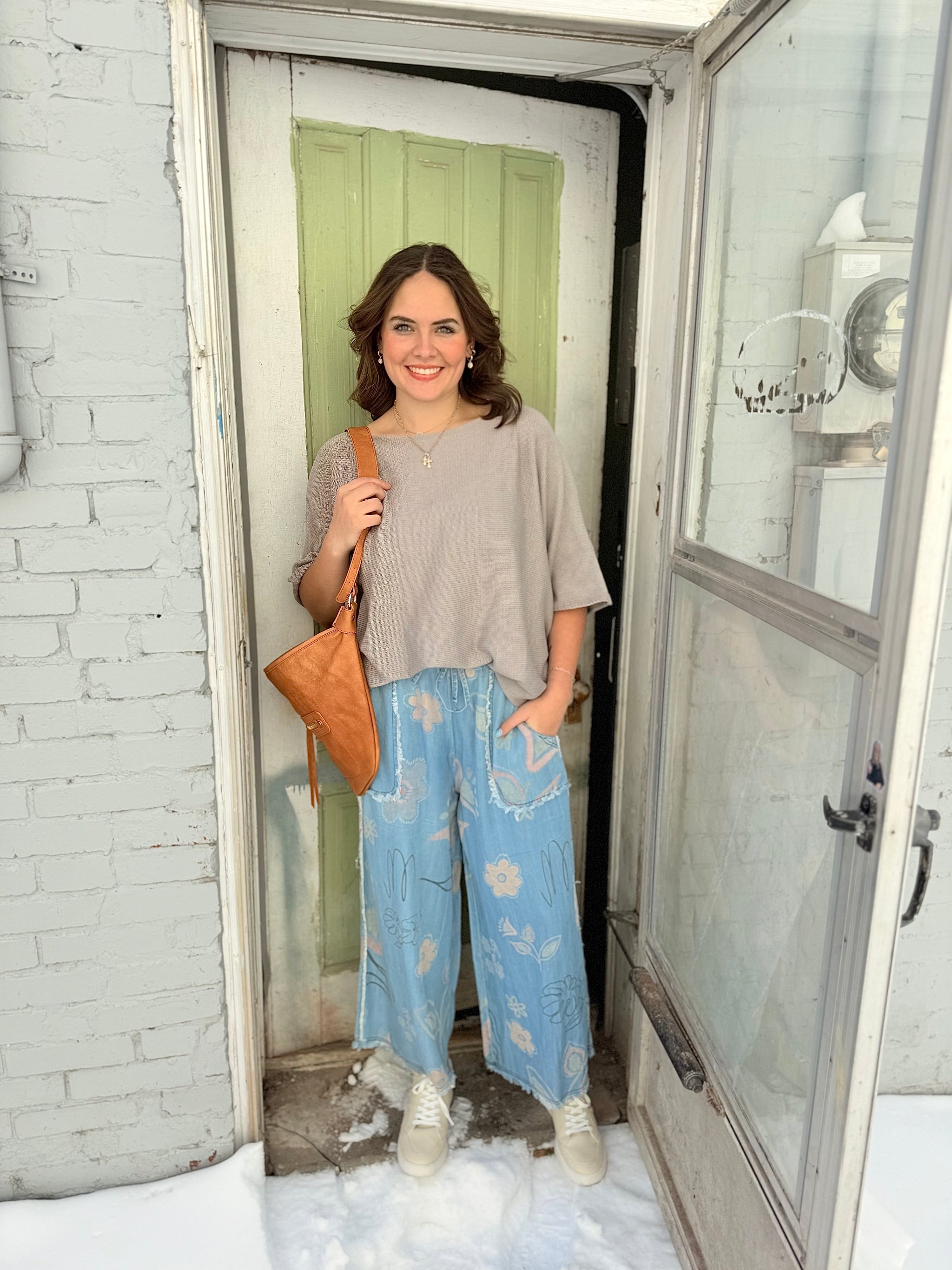These wide leg bottoms have an elastic back for an easy fit. They are woven with different prints, hand-stitched accents,...