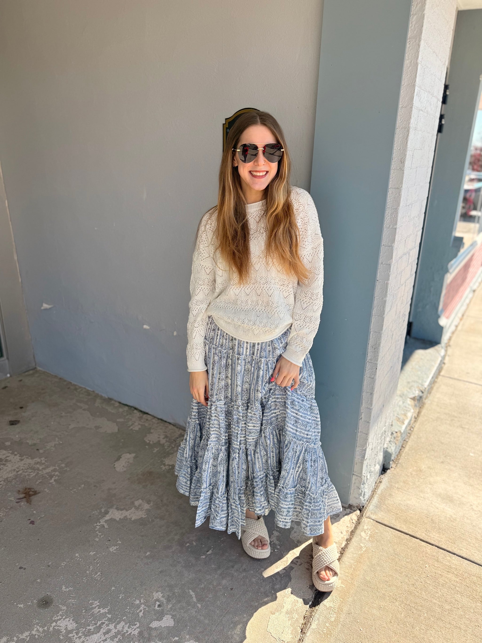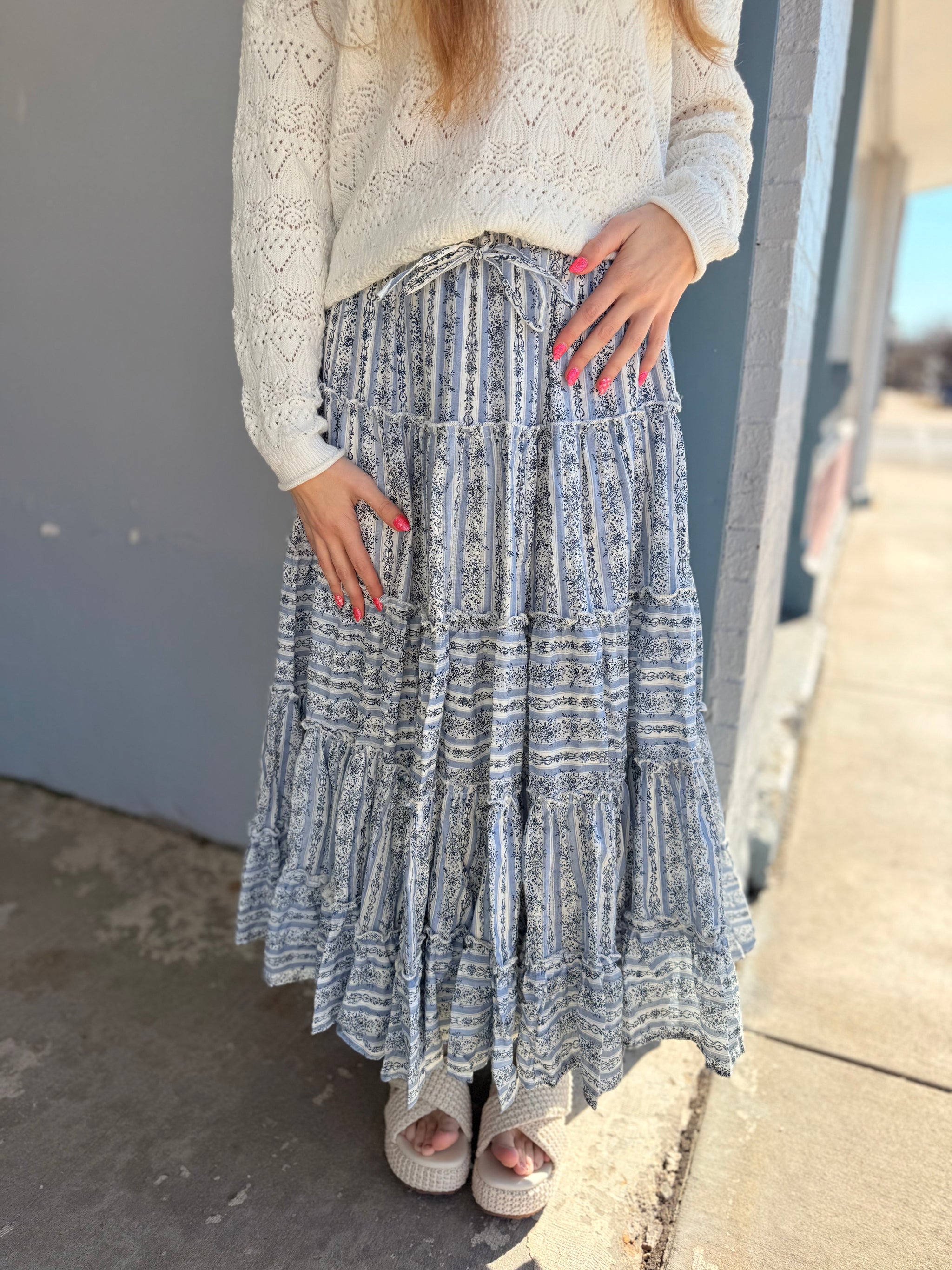 A gorgeous neutral blue huges with a delicated striped and floral pattern throughout. Multi layered design with a ruffled hem...