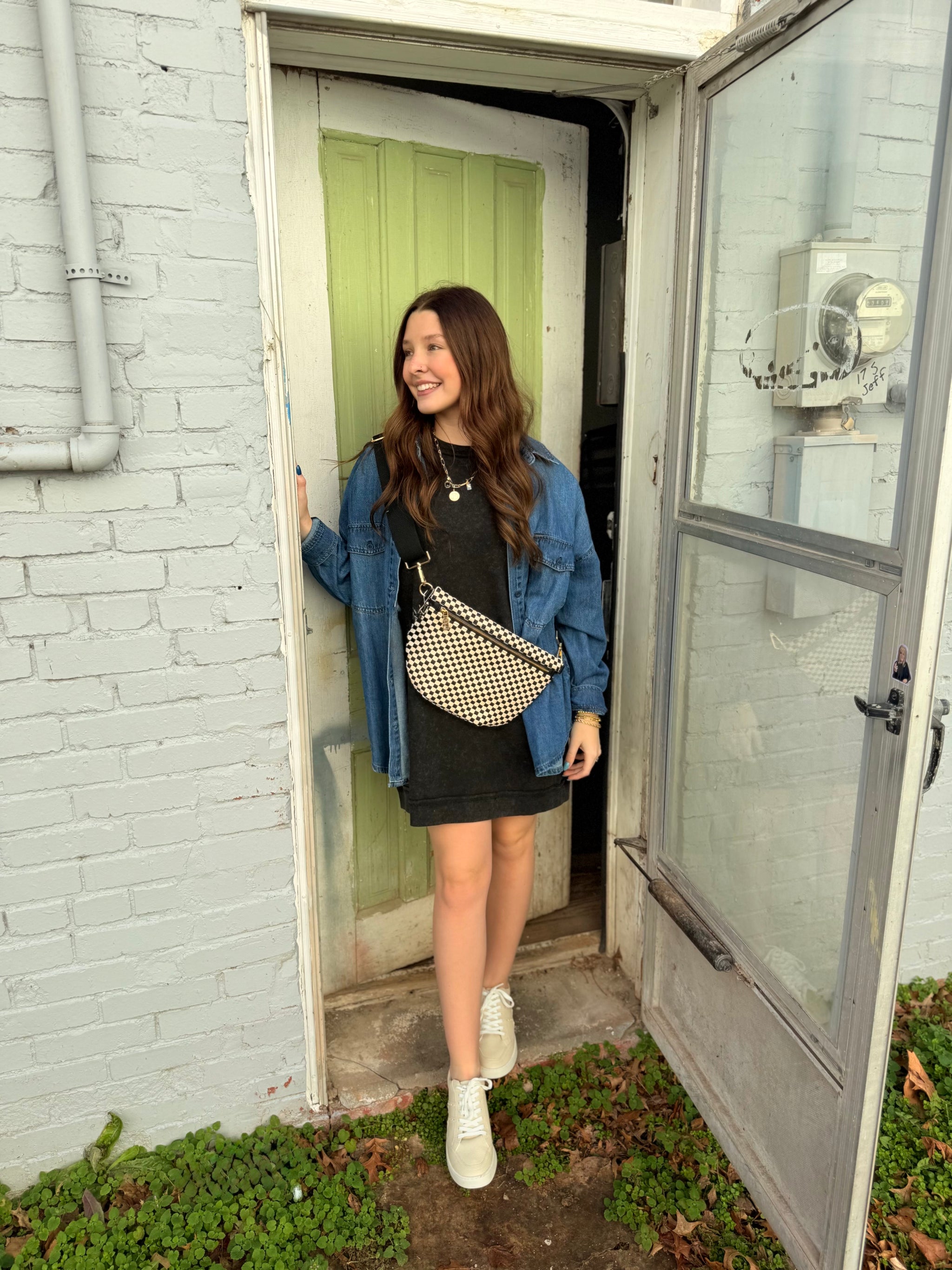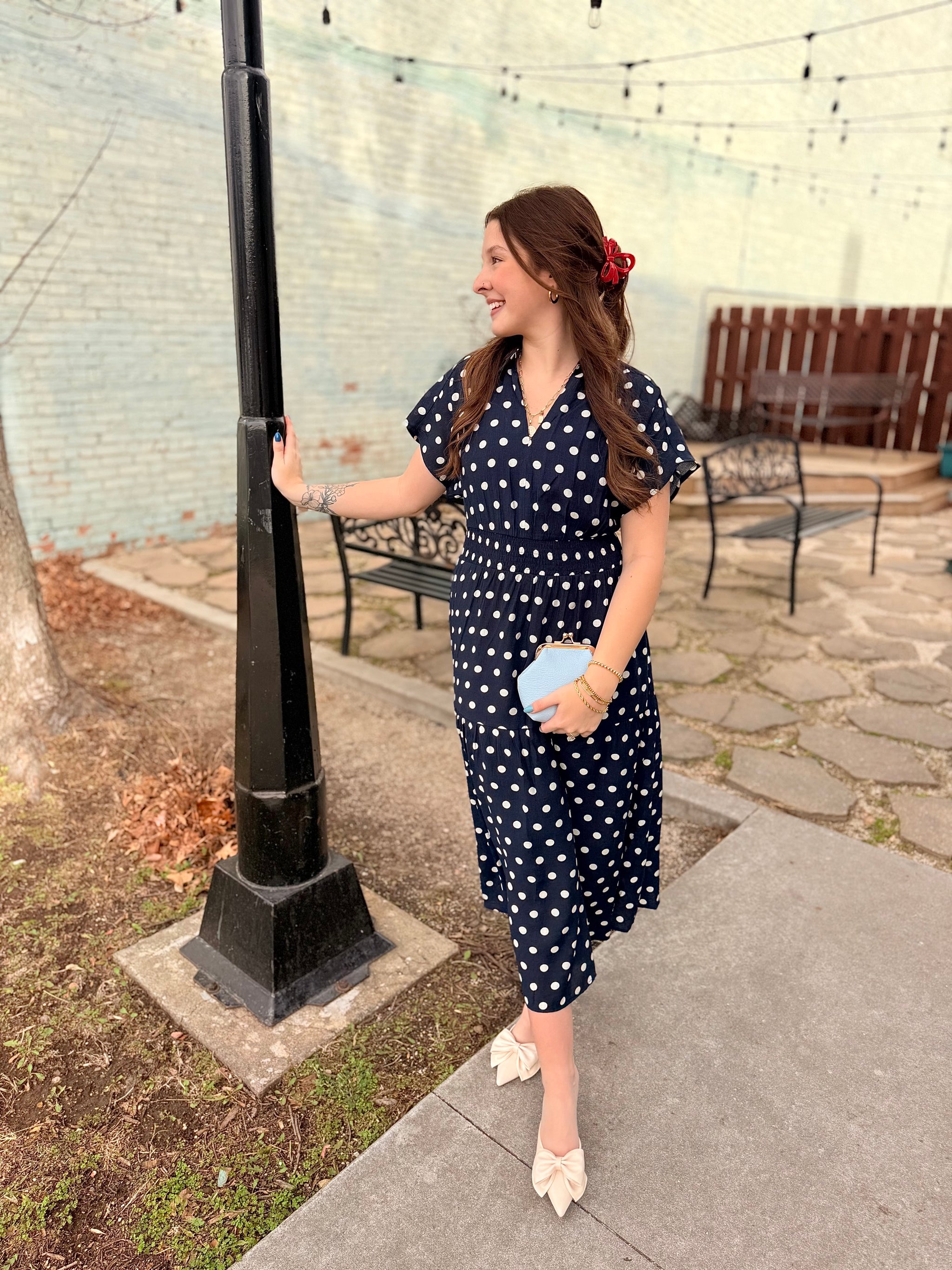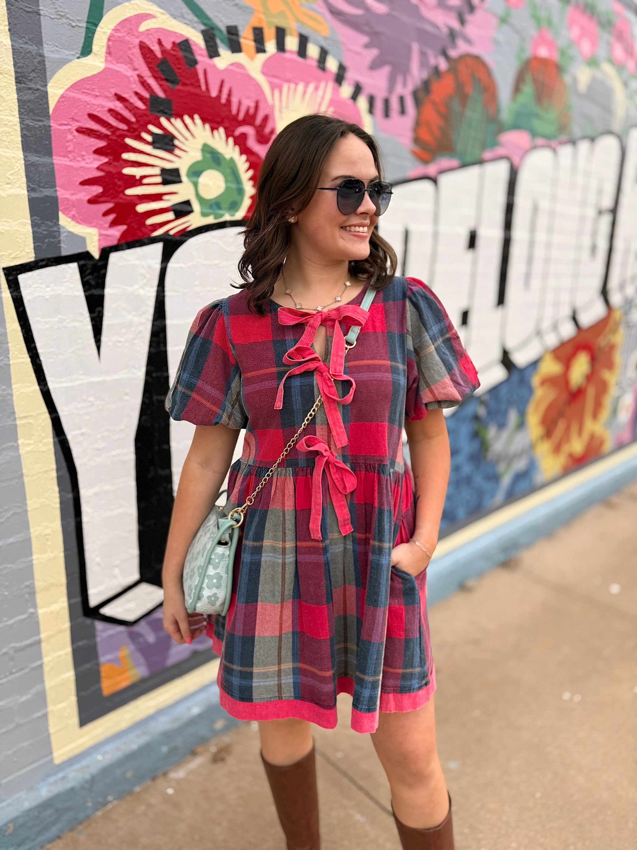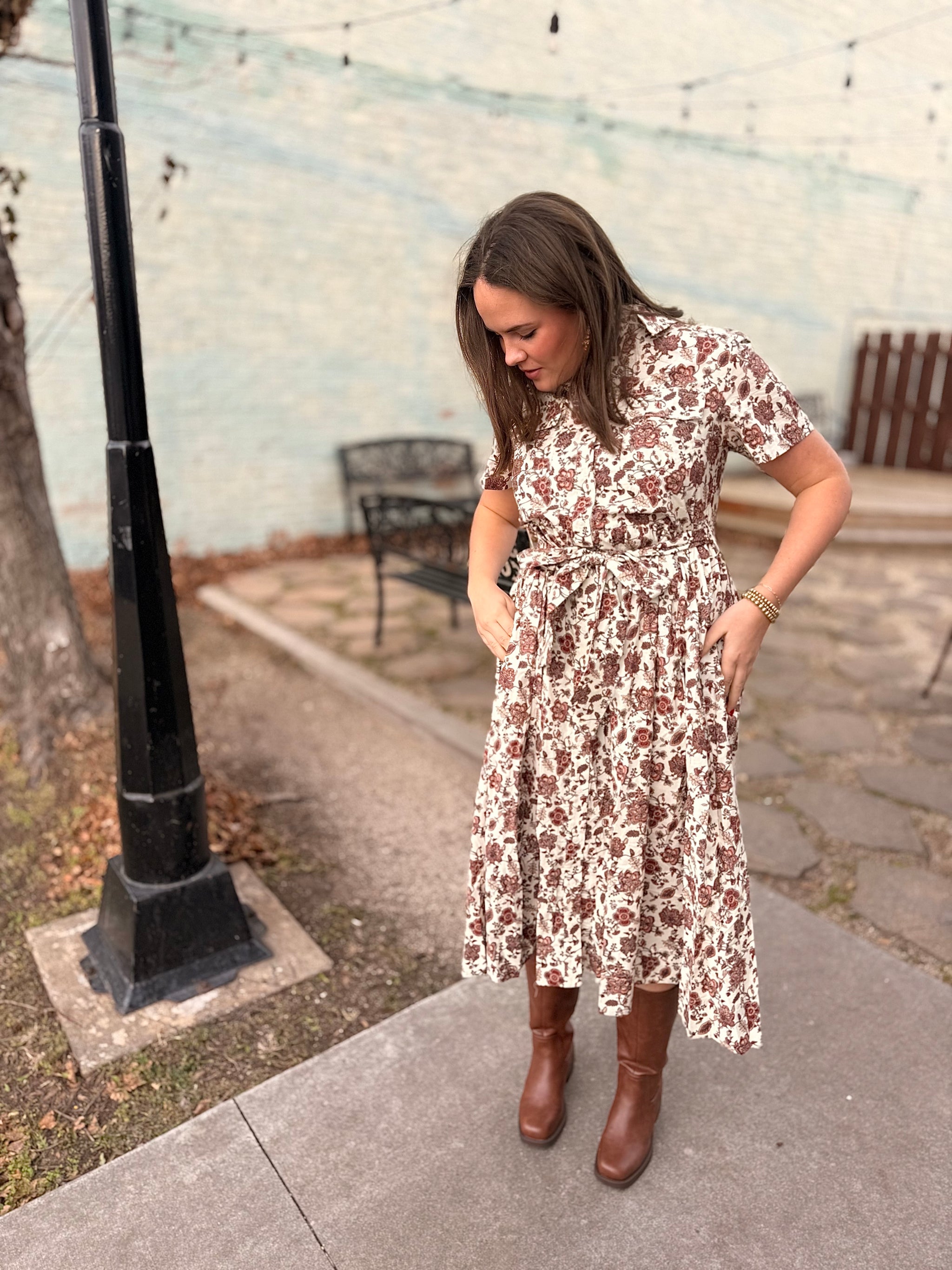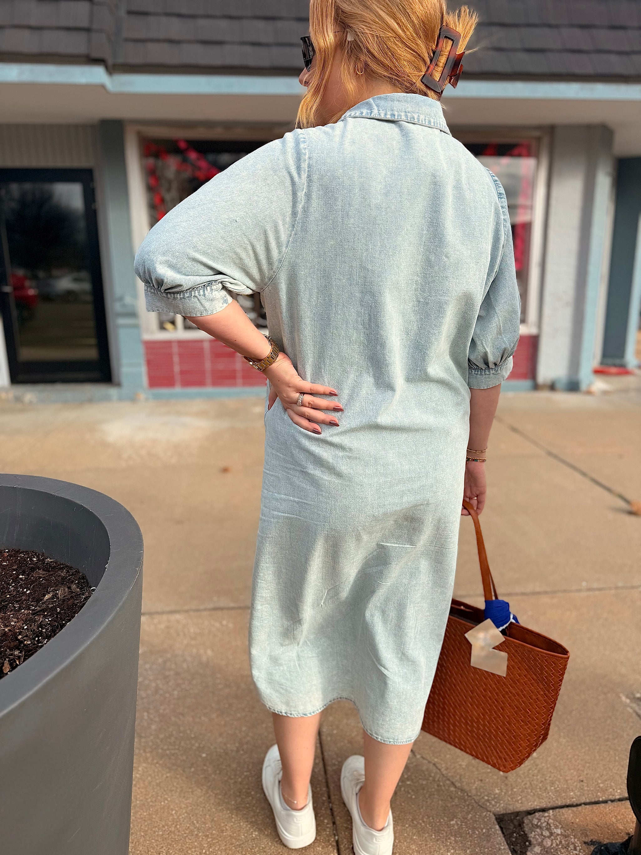 This gorgeous button front dress is a structured fit and a tie waist. So fun! 100% Cotton