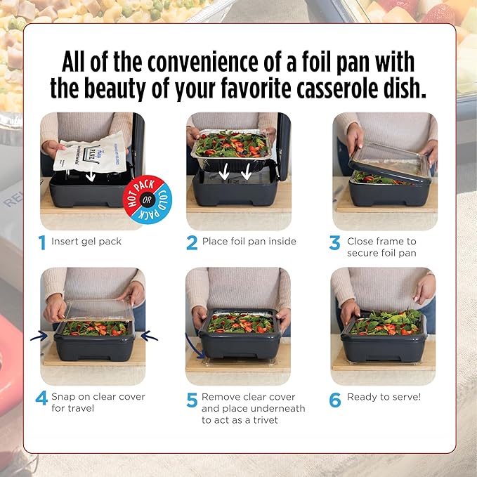 EASY TO USE and fits most standard half size foil pans (approx. 11.75 x 9 x 2.5). Open the attached frame, place your gel pack in, set your aluminum foil pan on top & snap on the clear top.