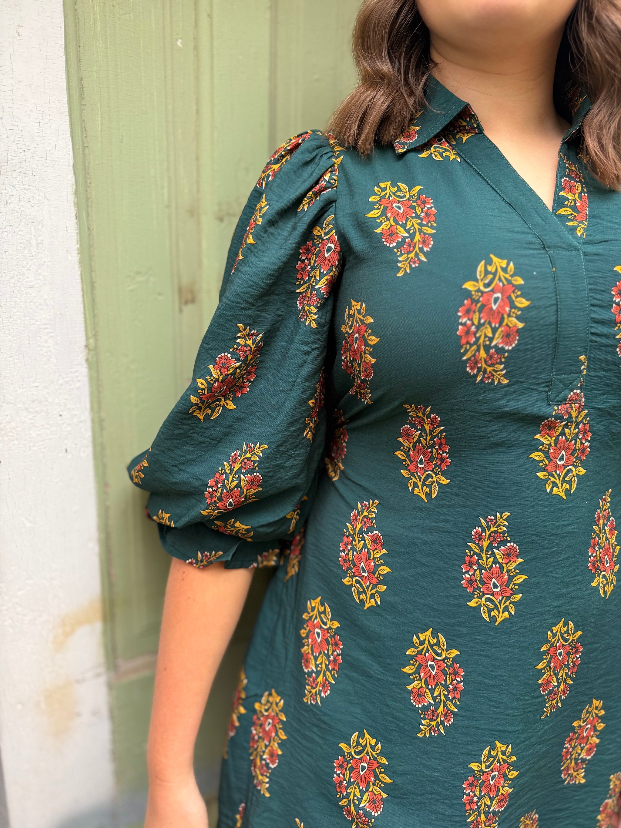 Floral print 3/4 puff sleeve top featuring half zip closure at front and contrast stripe ribbed stand collar and cuffs....