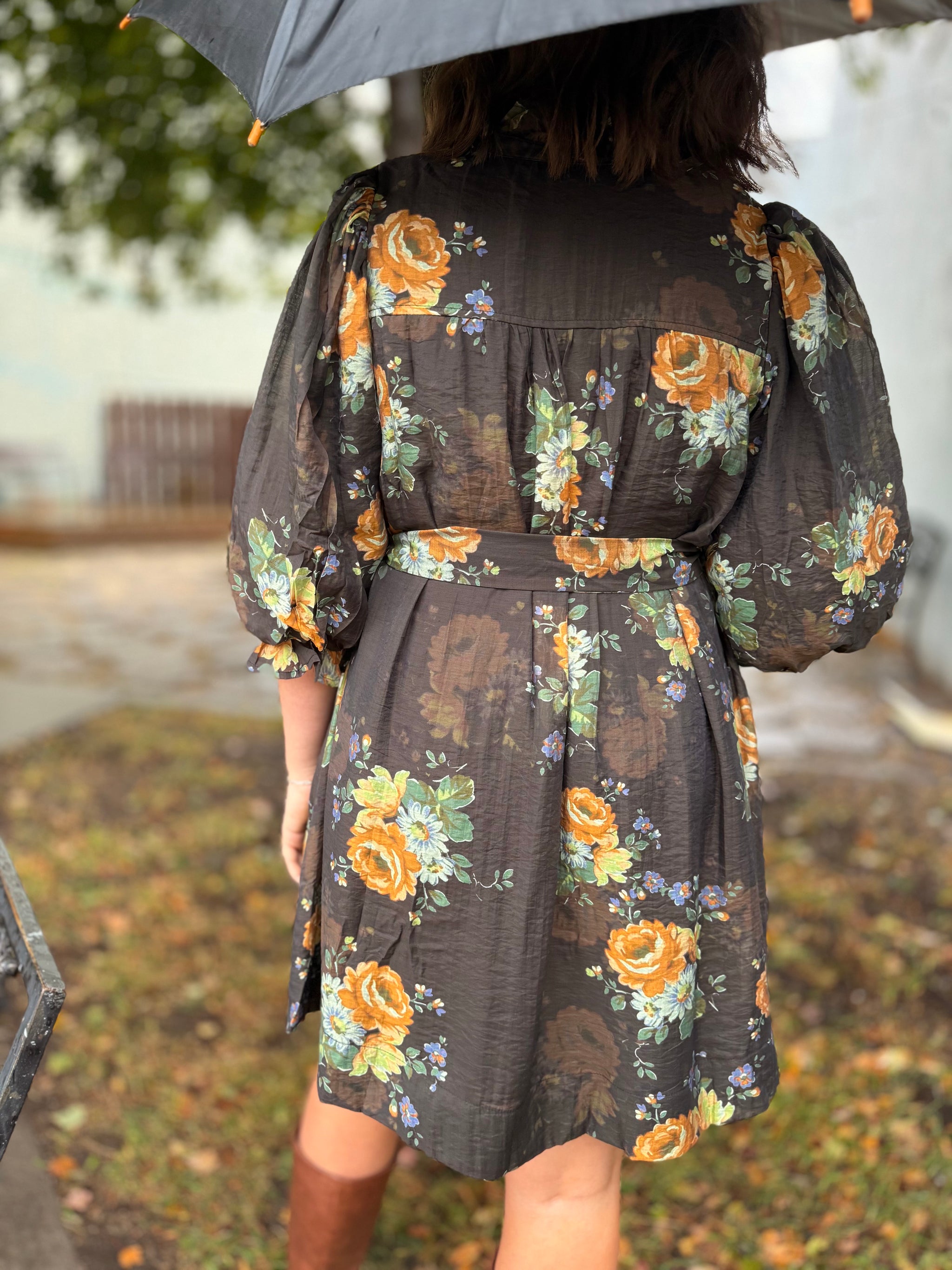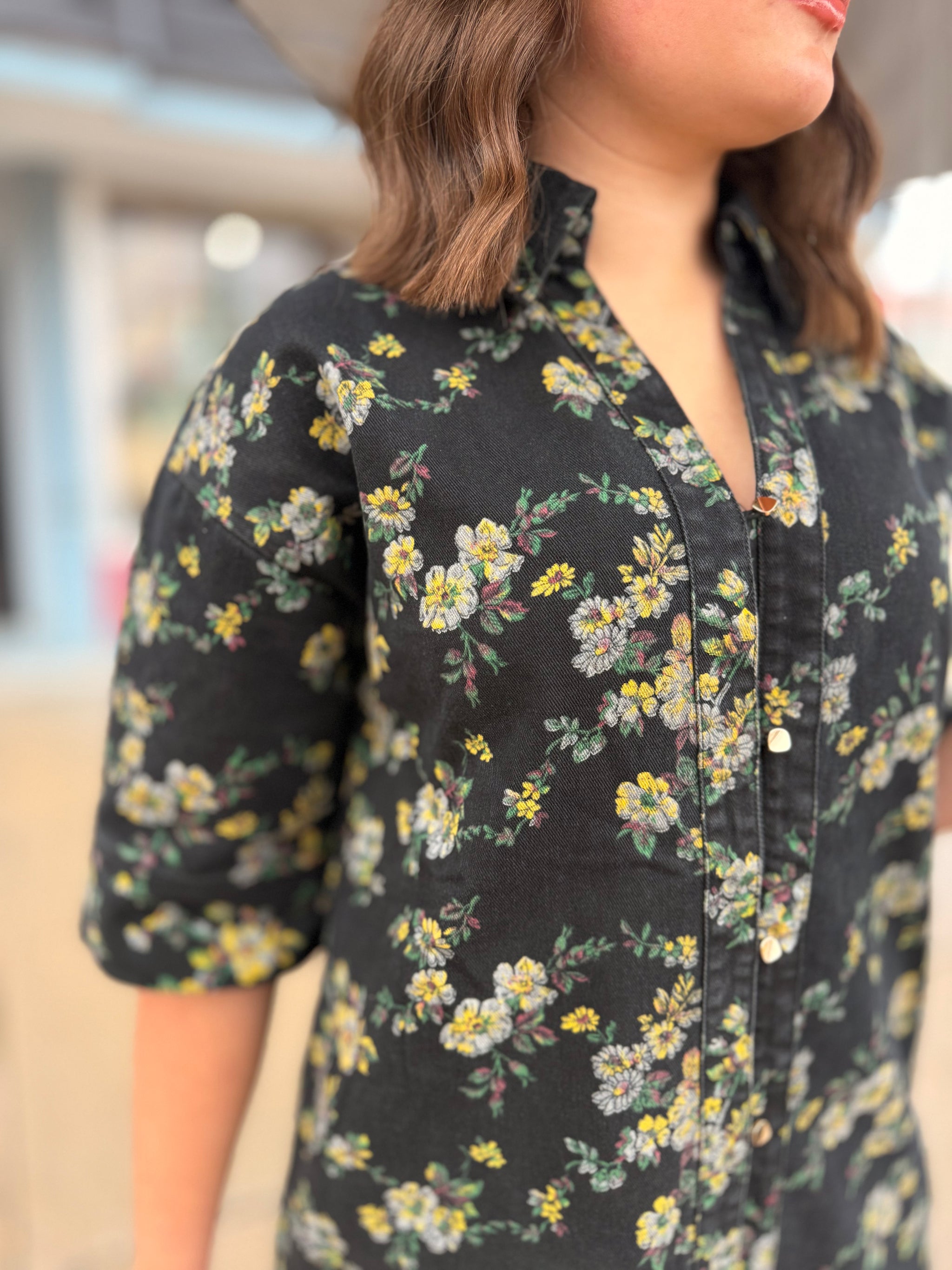 Botanical print long sleeve button-down top featuring back yoke with shirring. Lined. Woven. Non-sheer. Lightweight. Fabric Content 82%TENCEL 18%NYLON...